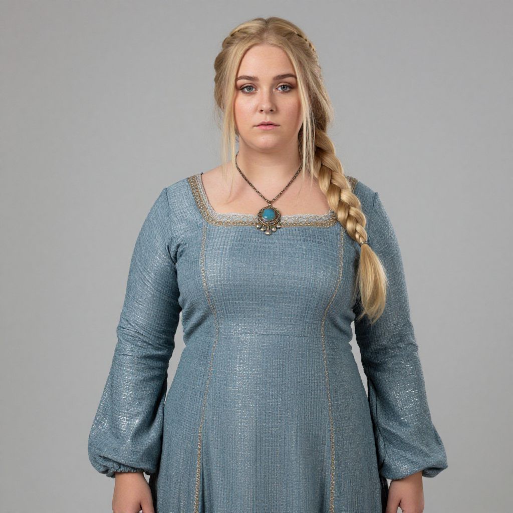 Photograph of a young blonde woman with a braid, wearing a blue, long-sleeved, textured medieval-style dress, and a blue gem