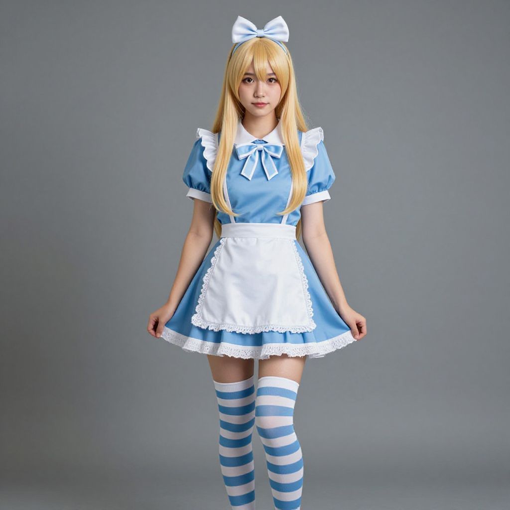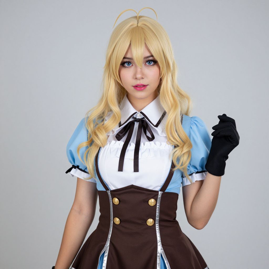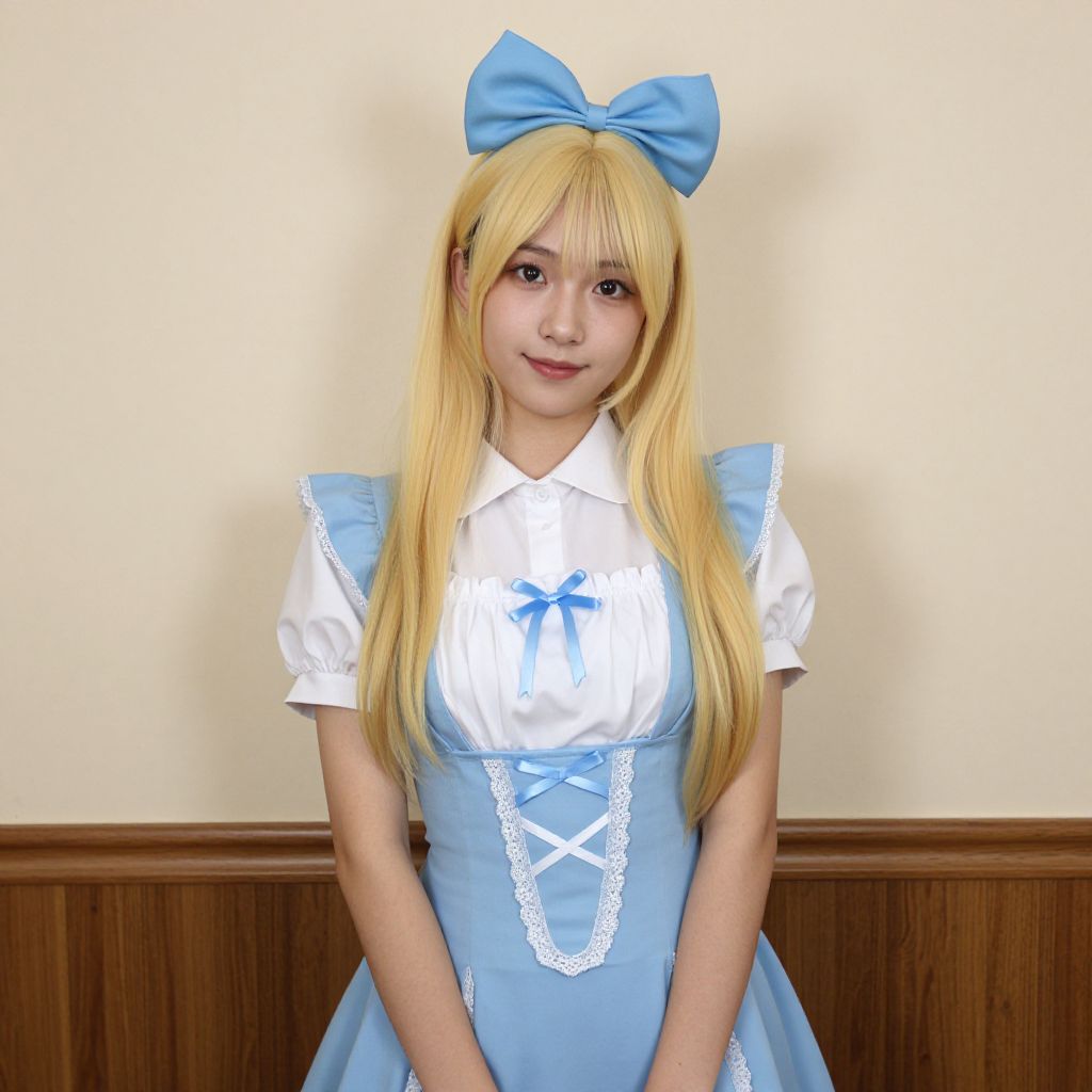 Woman with long blonde hair, wearing a red and white corset with a red bow at the bottom, and a red hat with flowers on the top.