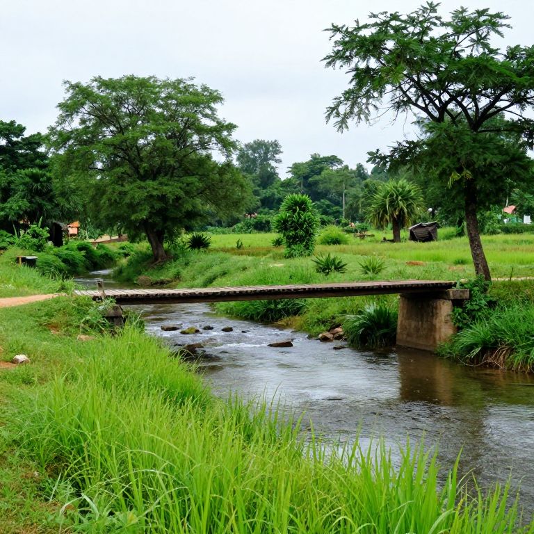 This photograph depicts a lush, green rural scene featuring a small, wooden bridge spanning a gently flowing, clear stream. The bridge is positioned horizontally across the middle of the image. Dense, verdant grasses and various shrubs surround the stream, while tall trees with thick canopies frame the background. The sky above is overcast, casting a soft, diffused light over the landscape. A narrow dirt path runs parallel to the stream on the left, and a small wooden hut is partially visible among the trees in the background. The overall atmosphere is serene and natural, with vibrant green hues dominating the scene.