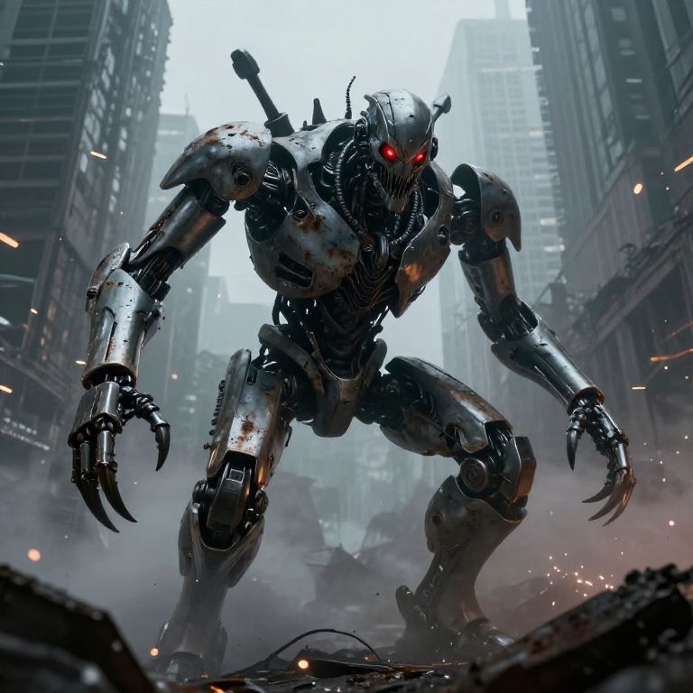 Sadistically menacing robotic creature in a post-apocalyptic cityscape, glowing red eyes and sharp metallic claws, rusted urban ruins in background, heavy fog and sparks flying, intense mood with dystopian sci-fi atmosphere, ultra-detailed and dramatic lighting