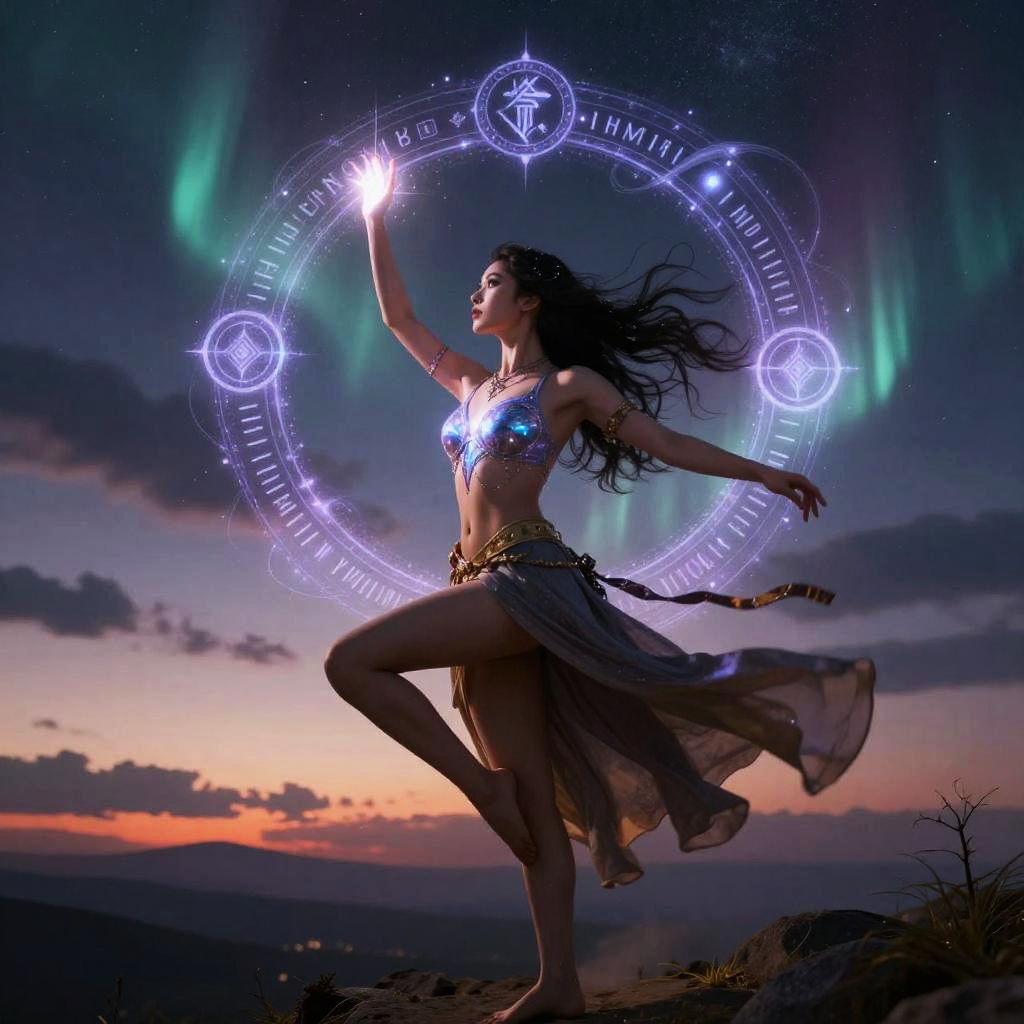 Ranni real form portrayed in a dynamic pose casting an ancient spell, her body glowing with arcane light, surrounded by intricate floating glyphs and swirling magical threads, set against a dramatic background of a twilight sky filled with shooting stars and magical auroras.