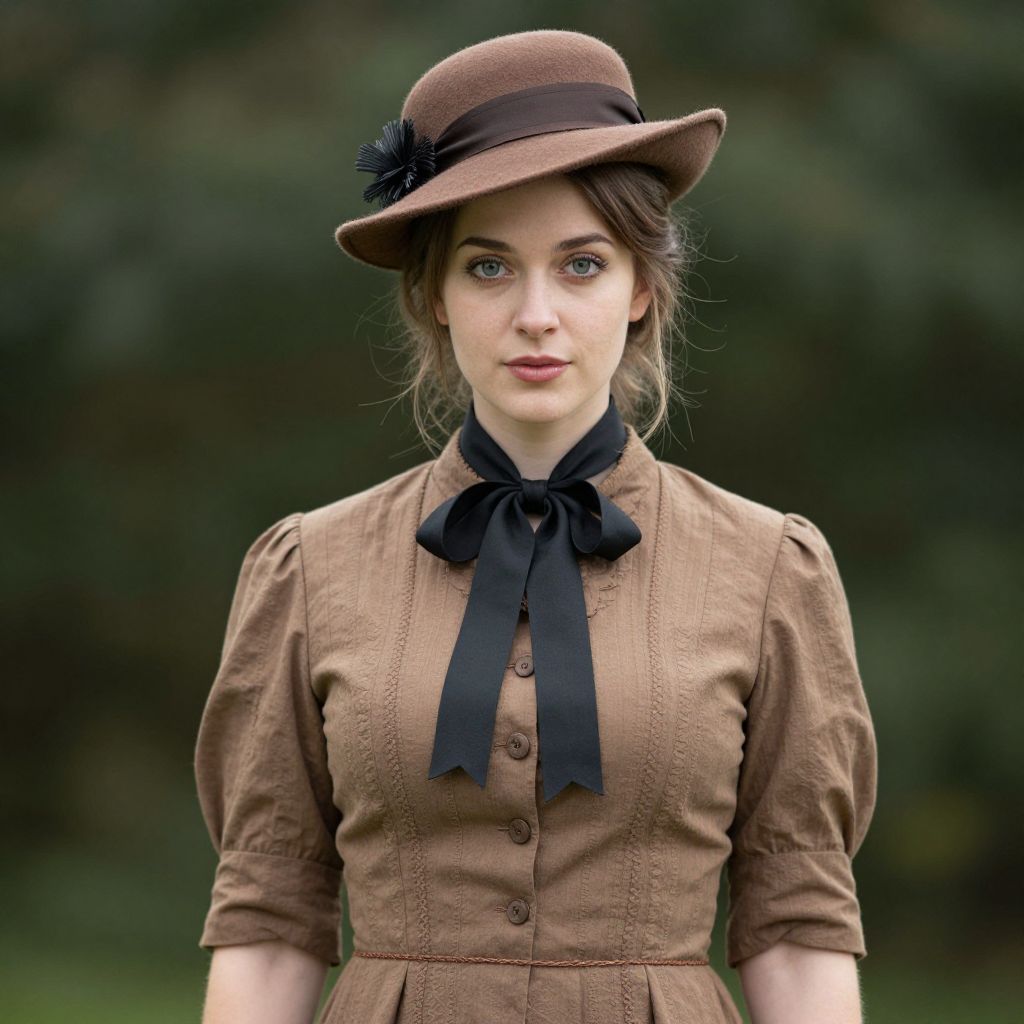 Photograph of a young Caucasian woman with fair skin and green eyes, wearing a vintage-style brown dress with puffed sleeves and a black ribbon bow at the collar. She has dark brown hair styled in an updo, topped with a brown hat adorned with a black feather. The background is a blurred, dark green forest, providing a natural contrast to her outfit. Her expression is neutral, and she stands centered in the image, exuding a timeless, elegant charm. The image is well-lit, highlighting the textures of her dress and the details of her hat.