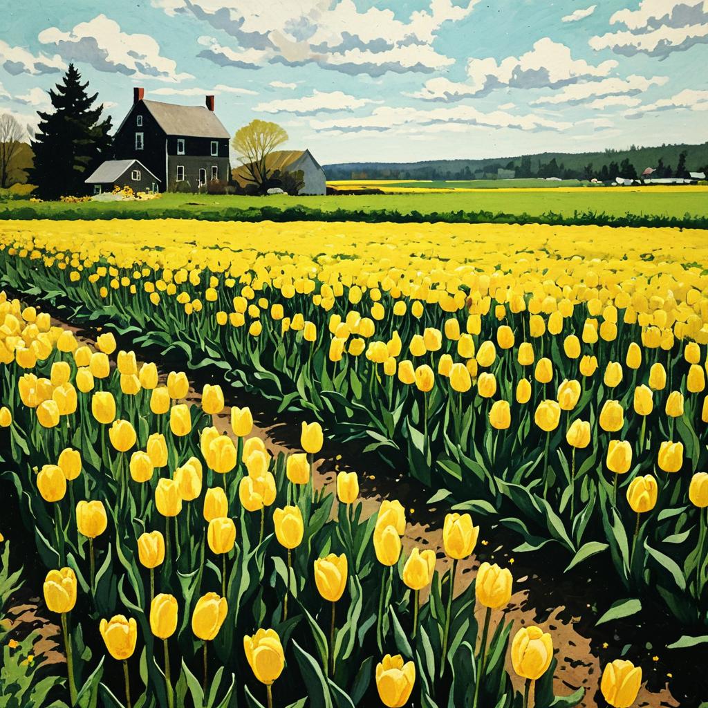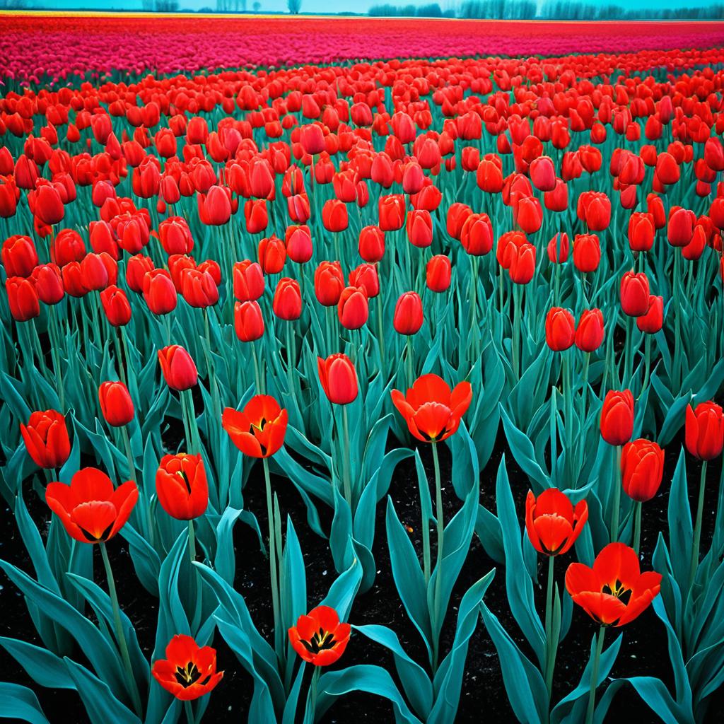Tulip fields in Wassily Kandinsky's abstract style, bold red and cool cyan, soft brush strokes, dynamic geometric shapes, blooming flowers, high quality