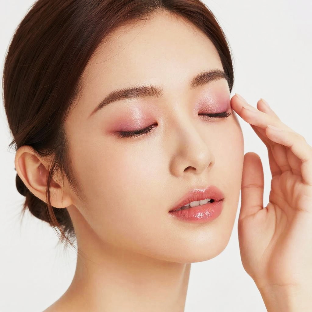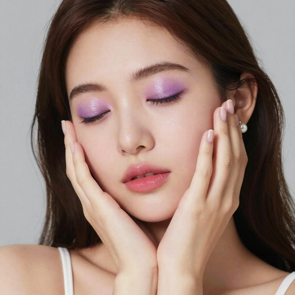 This is a close-up photograph of a woman with light skin and brown hair tied back. She has closed eyes with shimmery pink and purple eyeshadow, and glossy pink lips. Her right hand gently touches her forehead. The background is plain white, and the image has a soft, slightly overexposed look. She looks calm and relaxed.