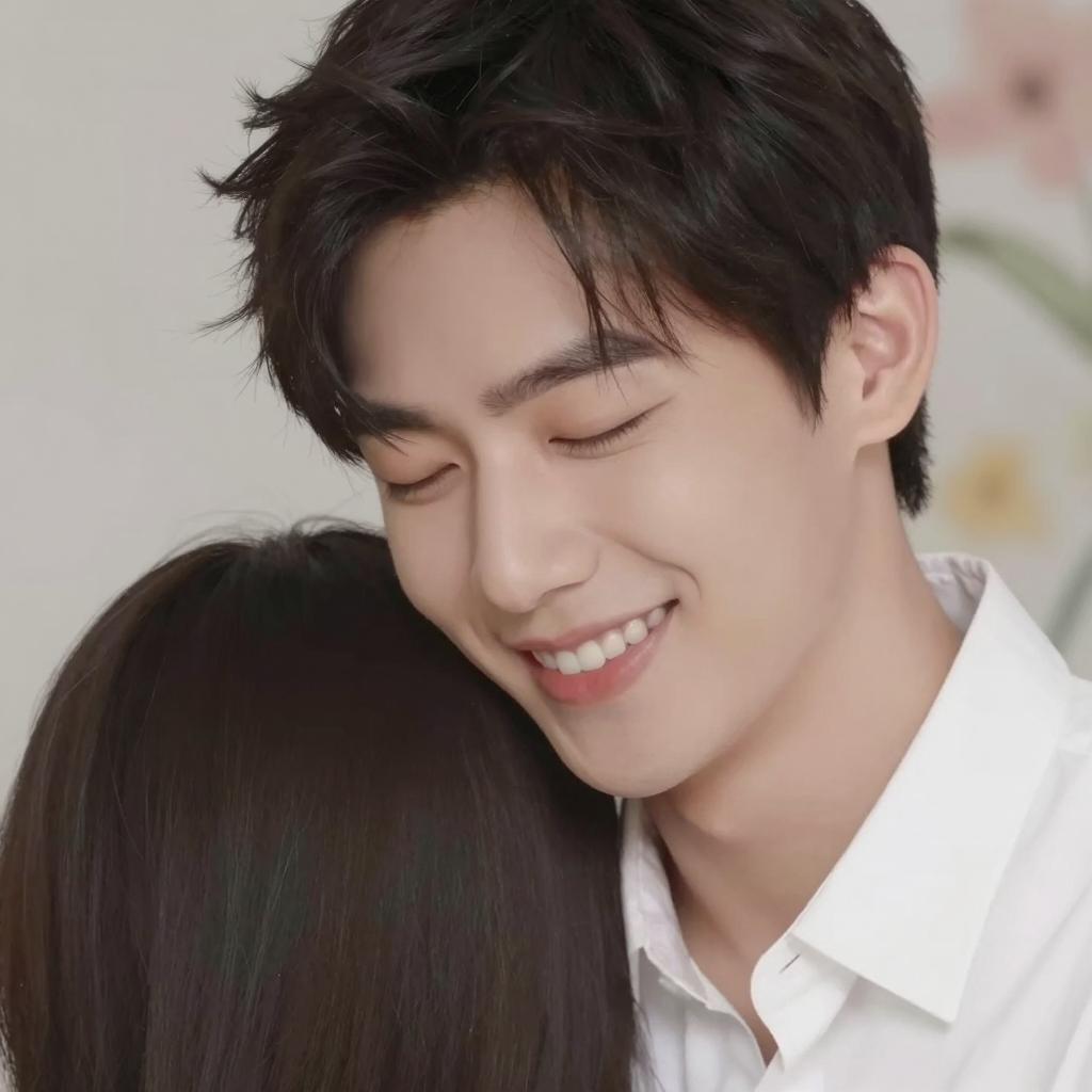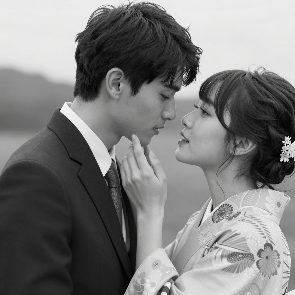 Close-up profile view of an Asian man wearing a checkered suit and white shirt, smiling gently, facing an Asian woman with wavy brown hair and a black strap top, looking up at him with a calm and focused expression. A small black microphone is positioned between their faces against a plain light background.