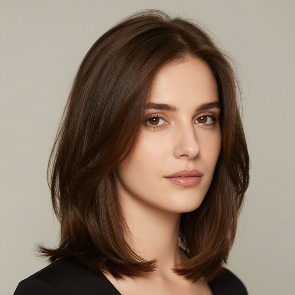 Caucasian woman with layered shoulder-length cut hairstyle, a well-proportioned and low-maintenance style ideal for modern women. The layers create dynamic movement without overwhelming the face, providing soft volume and a sophisticated silhouette. Neutral-toned backdrop with soft lighting.