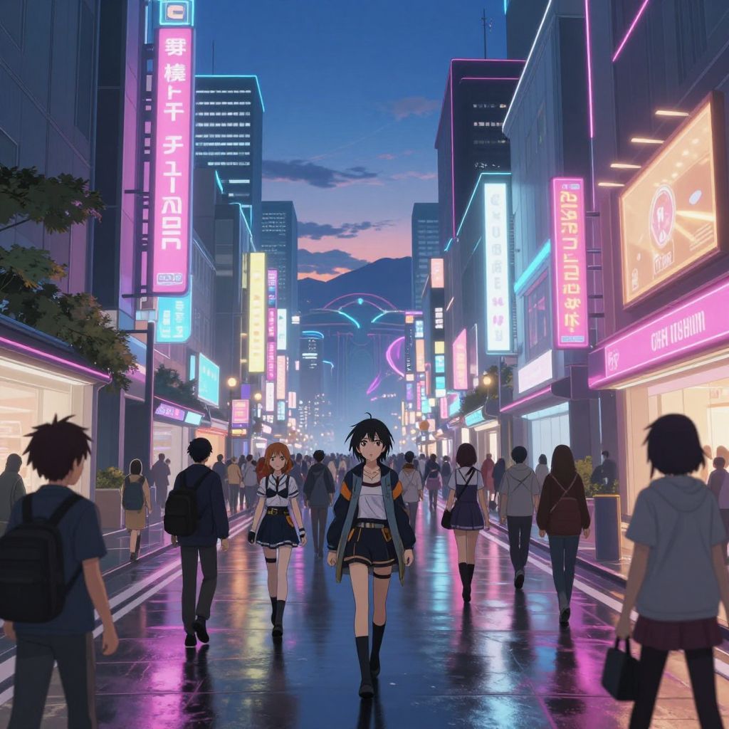 Japan Kobe anime style bustling cityscape at dusk, neon signs glowing, detailed character in school uniform walking, cherry blossoms falling gently, vibrant colors, dynamic composition
