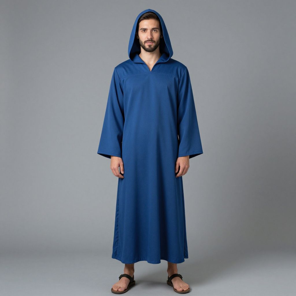 Photograph of a bearded man standing against a plain gray background, wearing a loose-fitting, long-sleeved, royal blue hooded robe that reaches his ankles. The robe has a simple, straight cut with a slightly open front. He has a serious expression and dark hair visible under the hood. He is barefoot with black sandals worn around his ankles. The robe's fabric appears smooth and slightly shiny. The image is well-lit with even lighting, emphasizing the solid color and texture of the robe. The man's stance is neutral, with arms relaxed by his sides.