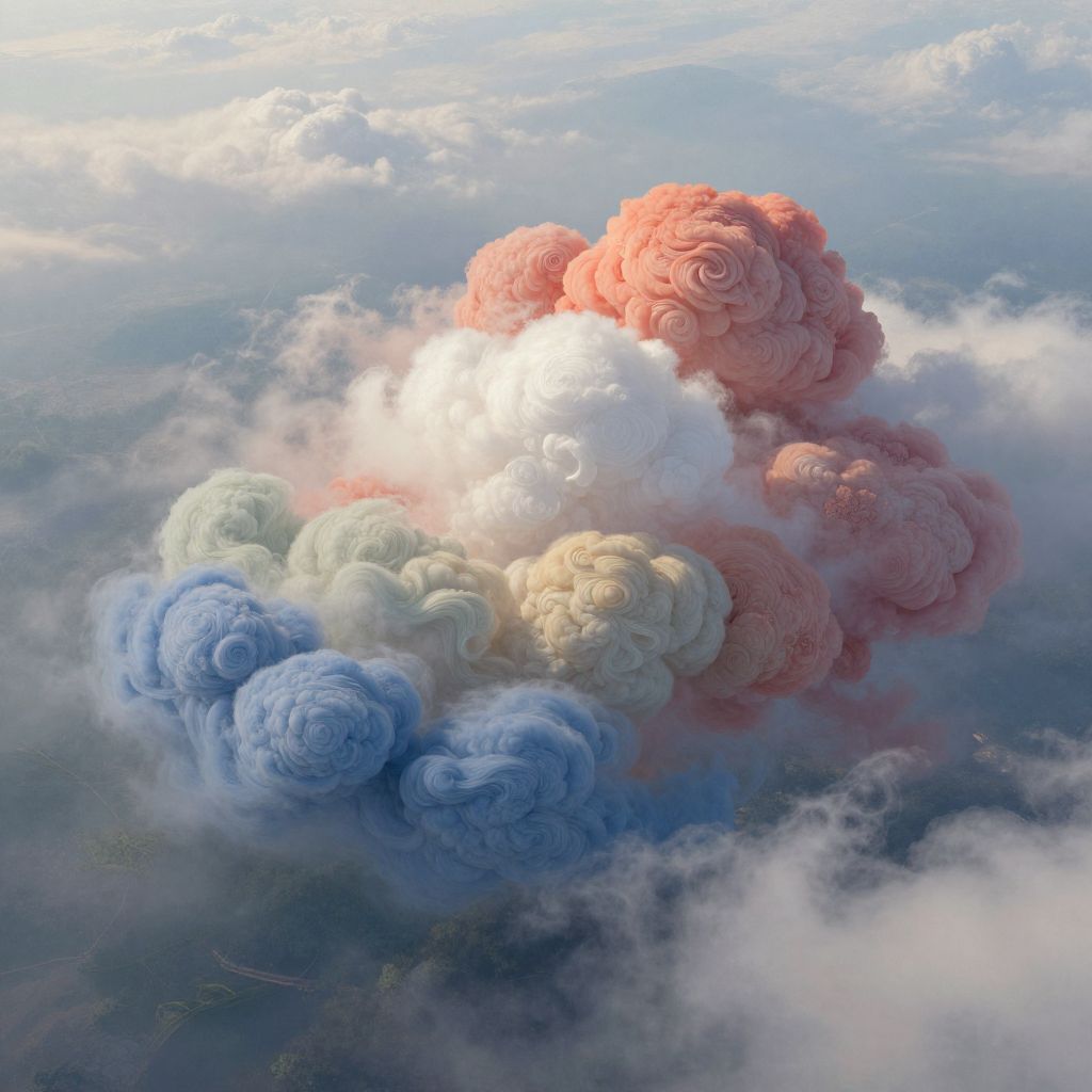 Photograph of surreal, colorful cloud formations: pink, blue, white, and beige rosette-like clouds illuminated by sunlight above a cloudy sky.