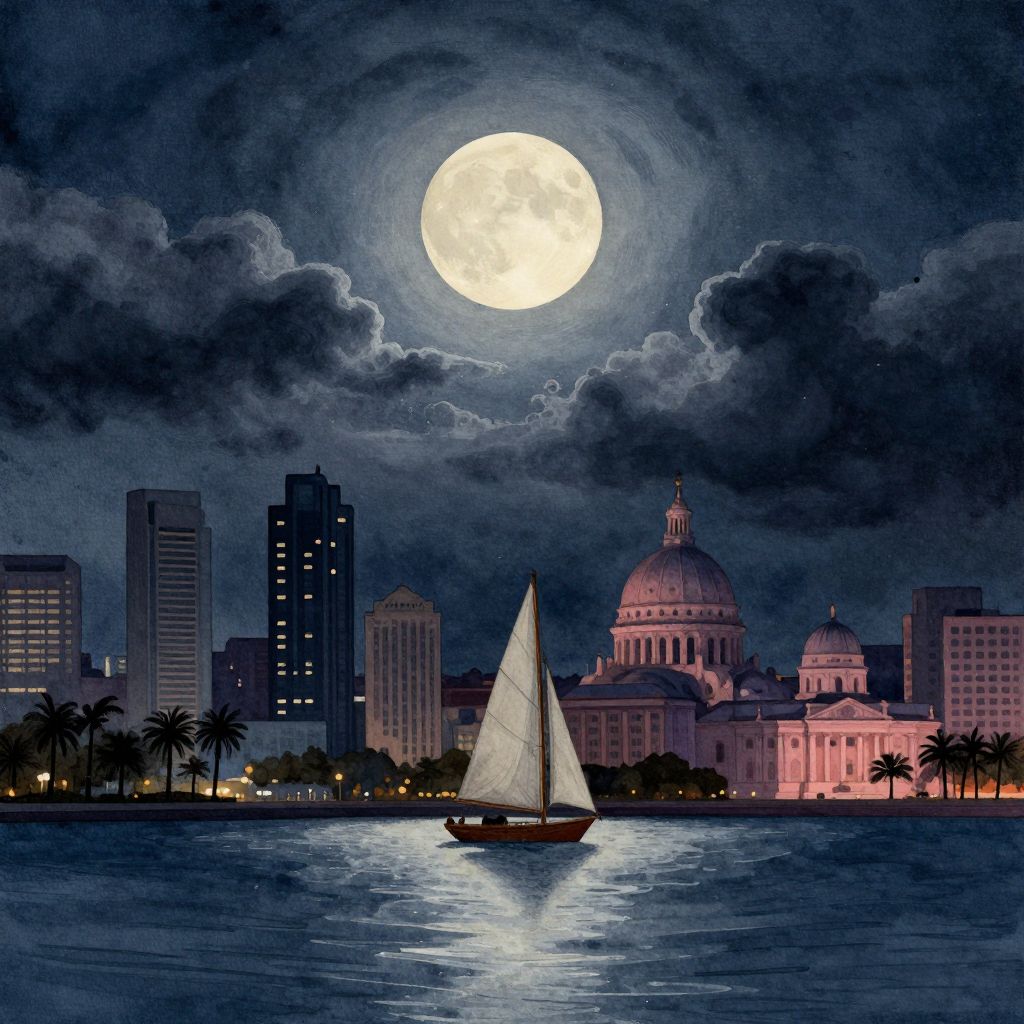 A digital painting depicts a nocturnal cityscape with a bright full moon illuminating dark, cloudy skies. In the foreground, a small sailboat with white sails glides on calm, reflective water. The background features a city skyline with modern high-rise buildings and a prominent domed building, likely a courthouse, bathed in pink light. Silhouetted palm trees line the waterfront. The moon's light creates a glowing path on the water's surface, enhancing the scene's serene and mystical ambiance. The color palette includes deep blues, purples, and pinks, with realistic textures and detailed lighting.