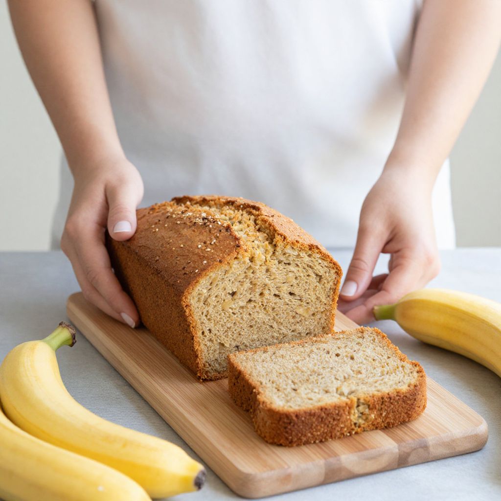 Photograph of a woman with long brown hair in a white shirt slicing a loaf of banana bread on a wooden board, surrounded by bananas and sliced bread