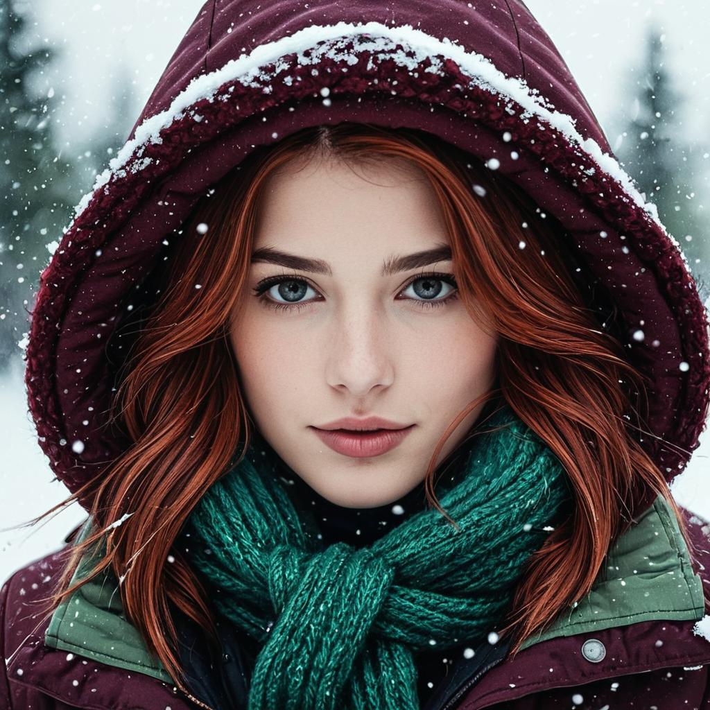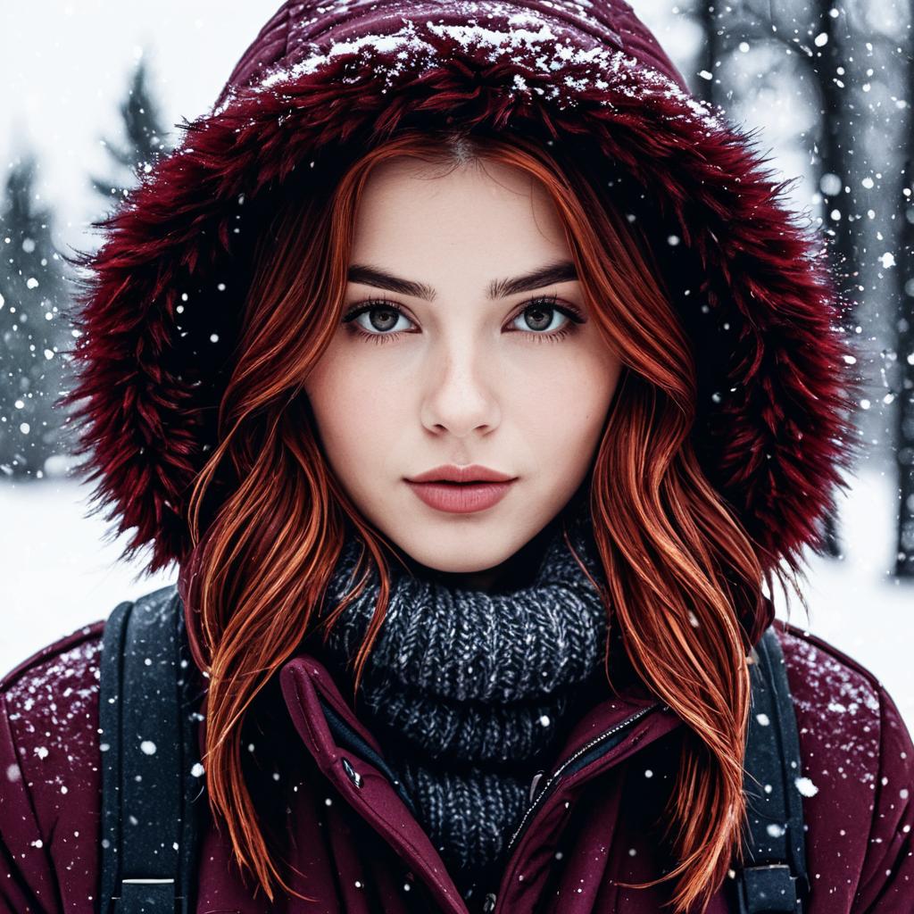 A young woman with hazel eyes and chestnut hair in the snow with frost-covered bushes in the background and snow resting on the surface, inspired by Camille Pissarro, plein air, a photorealistic painting