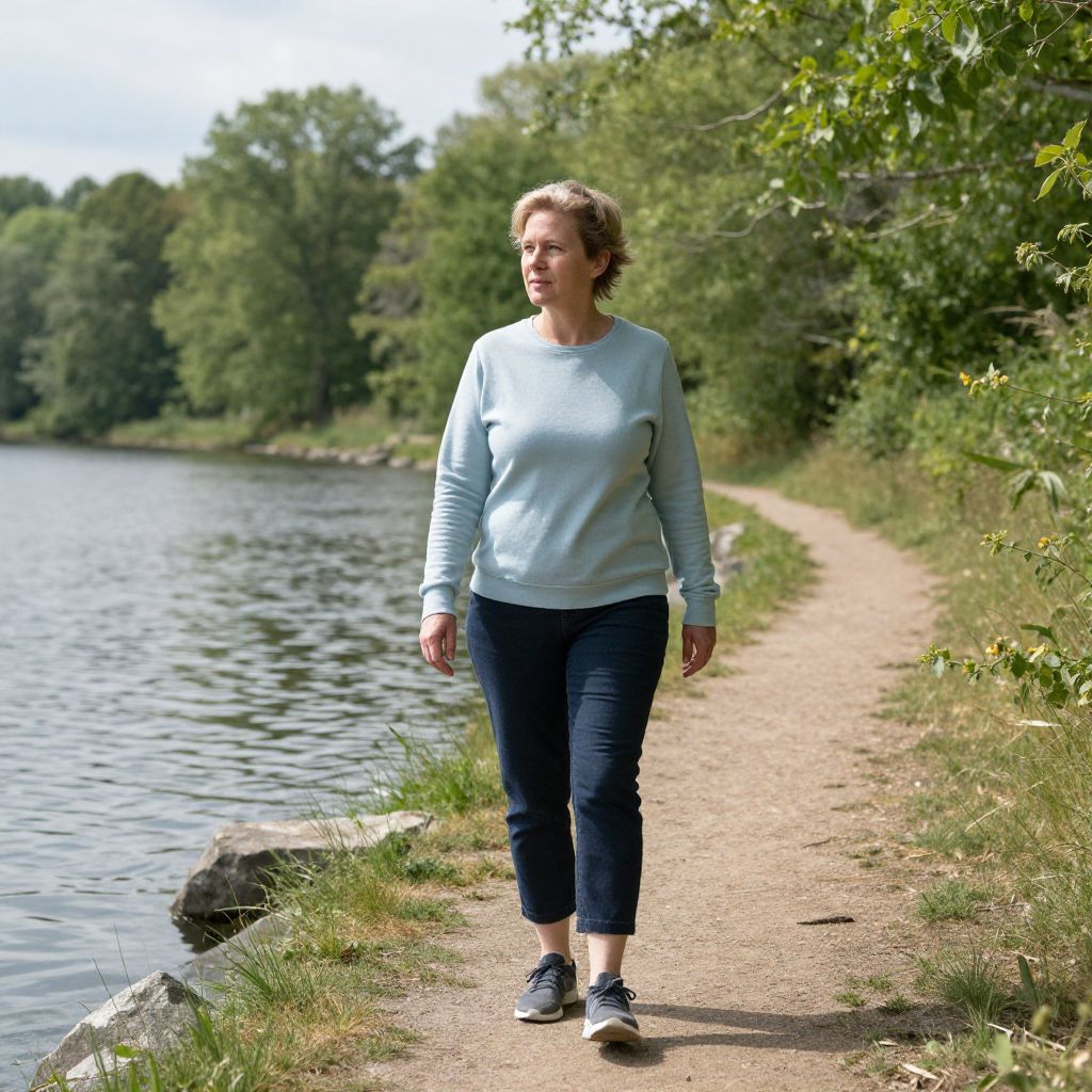 Photograph of a middle-aged woman with short brown hair, wearing a light blue sweater and dark blue pants, walking along a riverside path on a