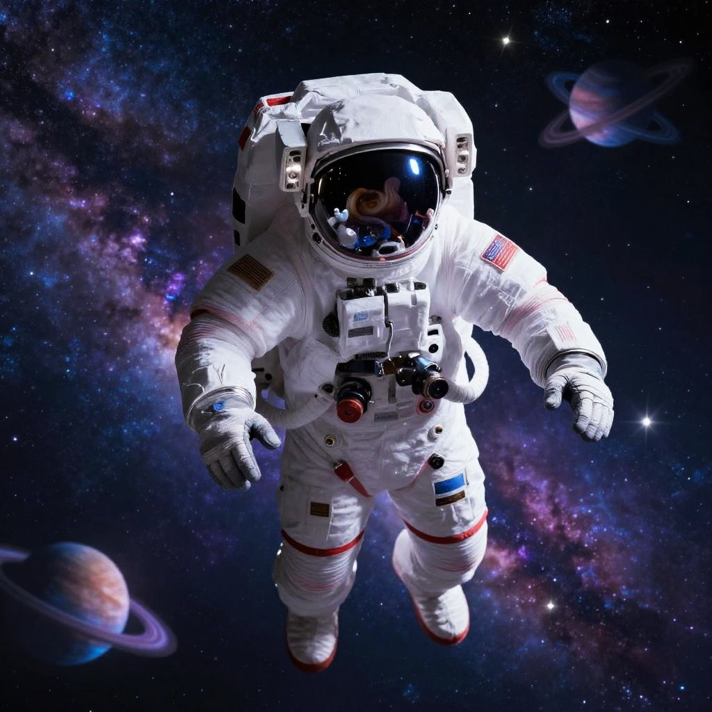 Photorealistic digital image of an American astronaut in a white spacesuit floating in space, surrounded by stars, galaxies, and planets.