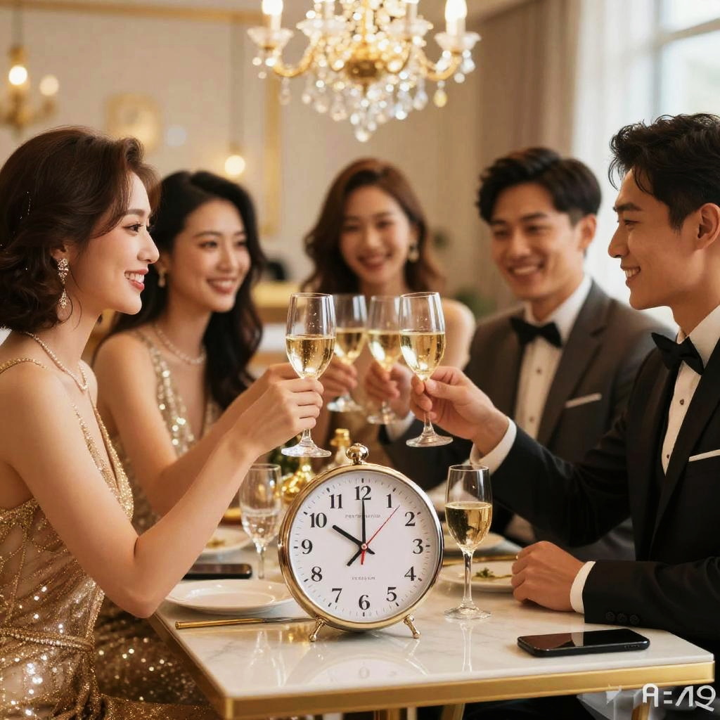 Photograph of five elegantly dressed Asian individuals in formal attire, toasting with champagne glasses at a luxurious dining table with a clock and chandelier.