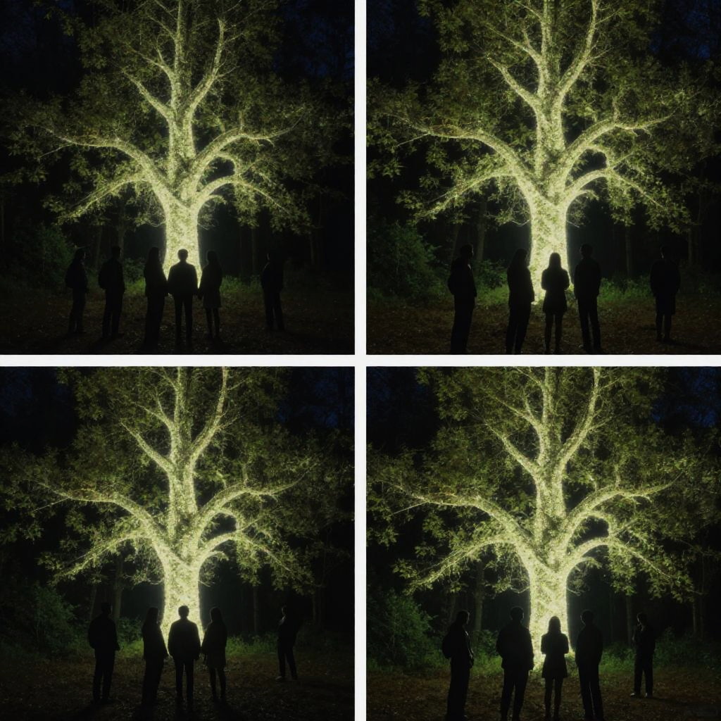 This photograph collage consists of four identical images, each showing a night scene of a tree adorned with glowing yellow lights. The tree's branches are brightly illuminated, creating a striking contrast against the dark, shadowy background. Silhouetted figures of people stand around the tree, their outlines barely visible in the dim light. The background includes faint outlines of more trees and foliage, adding depth to the scene. The glowing lights on the tree form intricate, almost ethereal patterns, and the overall image conveys a sense of warmth and wonder in a nighttime outdoor setting.