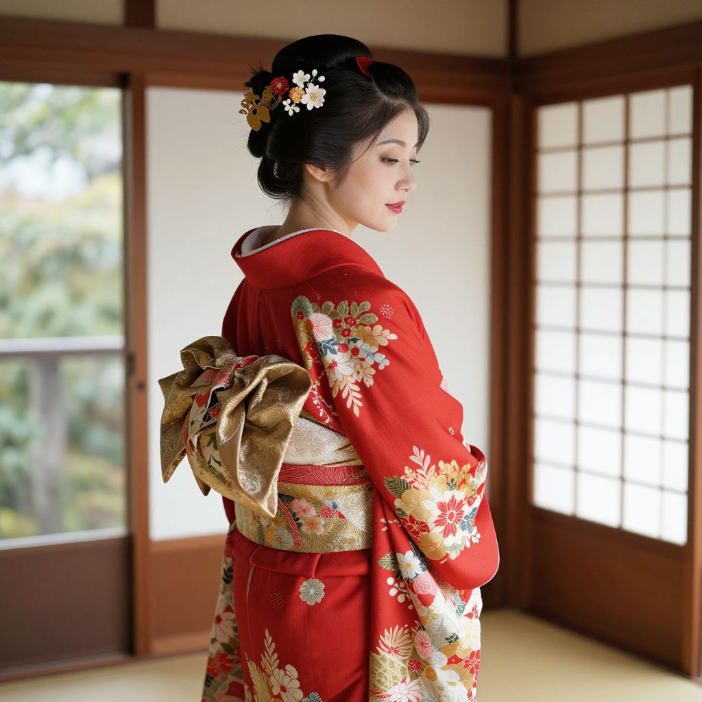 Elegant furisode kimono with vibrant red fabric adorned in intricate floral patterns and gold accents, worn by a woman with her hair styled in a traditional updo featuring a delicate floral hair ornament, set against the backdrop of a serene Japanese room with wooden frames and soft natural light filtering through shoji screens.