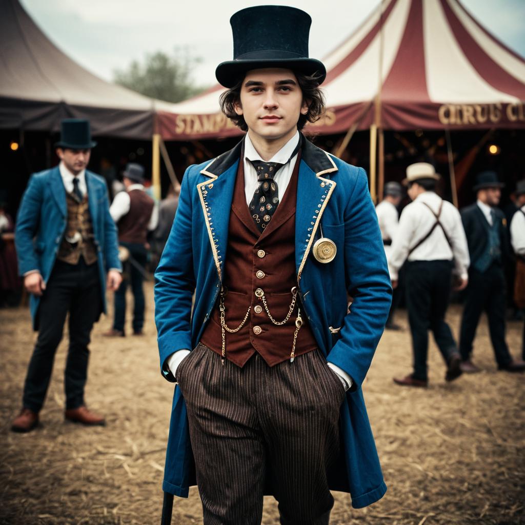 Portrait of a young man wearing a blue steampunk circus costume featuring a top hat, brown vest with gold chains, striped brown pants, white collared shirt, black patterned necktie, and a blue tailcoat with gold trim. He stands confidently with hands in pockets in front of a vintage circus tent, holding a cane. The setting is outdoors with a blurred background of similarly dressed men and a red and white circus tent.