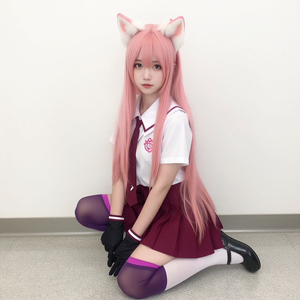 "yandere costume, 1girl, solo, animal ears, pink hair, long hair, skirt, school uniform, thighhighs, looking at viewer, shoes, gloves, socks, fox ears Realistic photo of casual sexy person with pretty face"