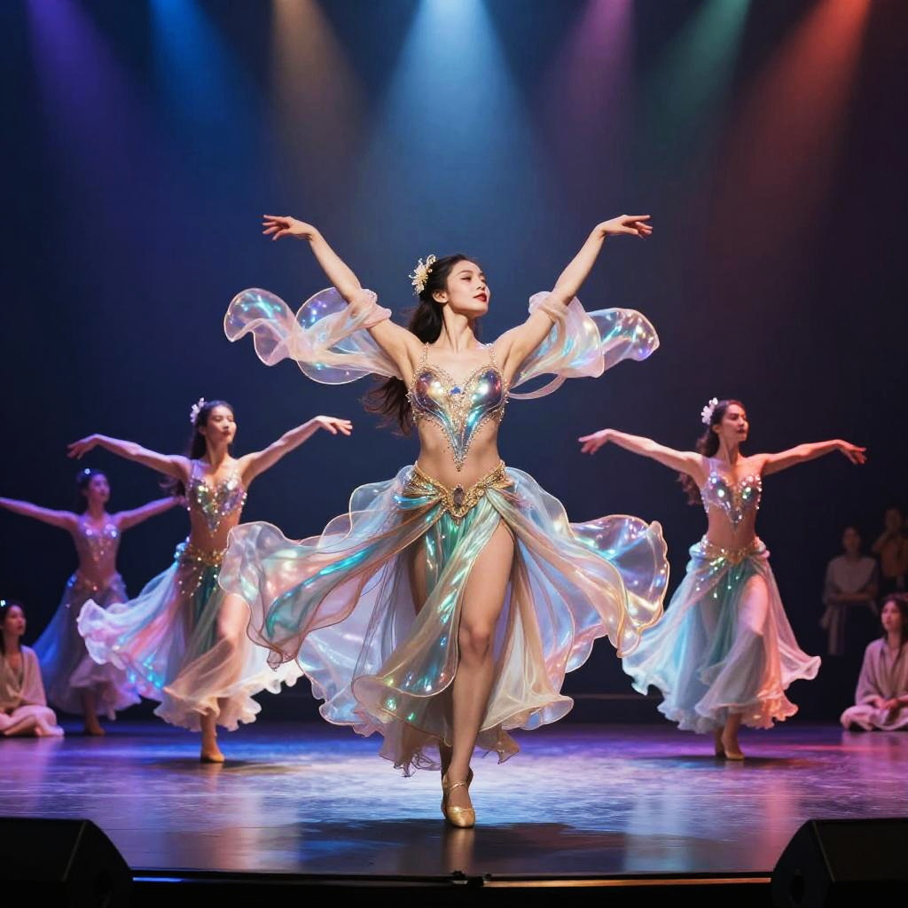 Realistic photo.Art by Clara Johnson, full body scene of a dynamic dance performance, with dancers in flowing costumes, colorful lights illuminating the stage, and an audience captivated by the spectacle. Intricate and highly detailed digital painting, with stunning textures, iridescent and luminescent effects. The scene captures breathtaking beauty and evokes a divine presence, with a magical and serene atmosphere, pure perfection. realistic photo