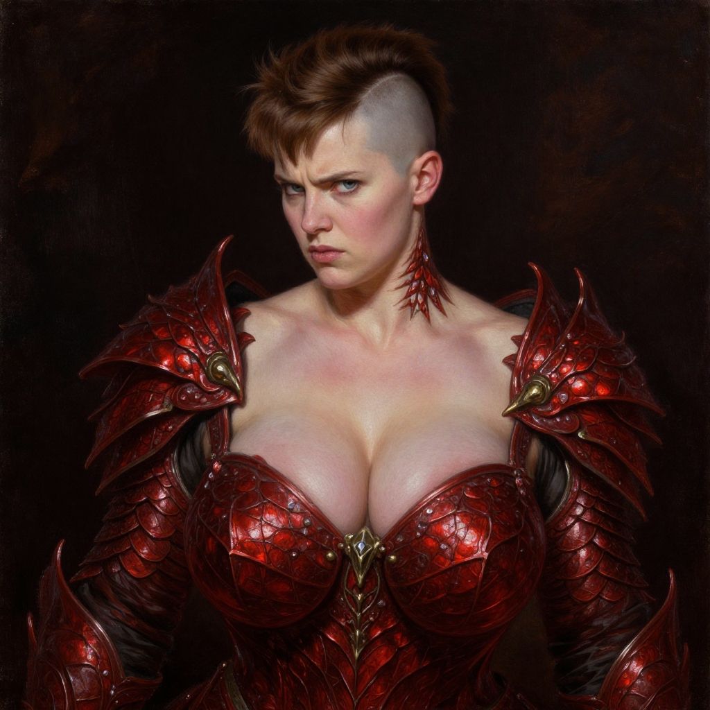 Sides of head shorthair, Photorealistic oil painting of (beautiful:1.1) (bright eyes) (half-dragon warrior-princess:1.2) with (intricate metallic red brass scales seamlessly melded into arm and neck:0.9), 18-year-old, (strawberrybrown undercut hair:1.1) (bare shoulder:1.3), (medieval fantasy clothing:1.2), grimdark fantasy, (medieval) fantasy, high fantasy, epic fantasy, (upper body:1.3) (medium shot:1.3) taken with (fujifilm xt3:1.1), film grain, dark style, raking light dramatic hard shadows, (dramatic lighting:0.9), material contrast, cinematic composition, intricate details, masterpiece, visually stunning, evocative, vivid deep hues, brass, Crystal, (body transformation:1.2), , realistic eyes, scaleborn, scales, undercut, woman, royal, pale skin, busty, massive breasts, k cup size breasts, red armor, short hair, bobcut, undercuthair, side of head shaved, curvy, wide hips, big butt templesbuzzcut, annoyed expression, light brown flaccid mohawk