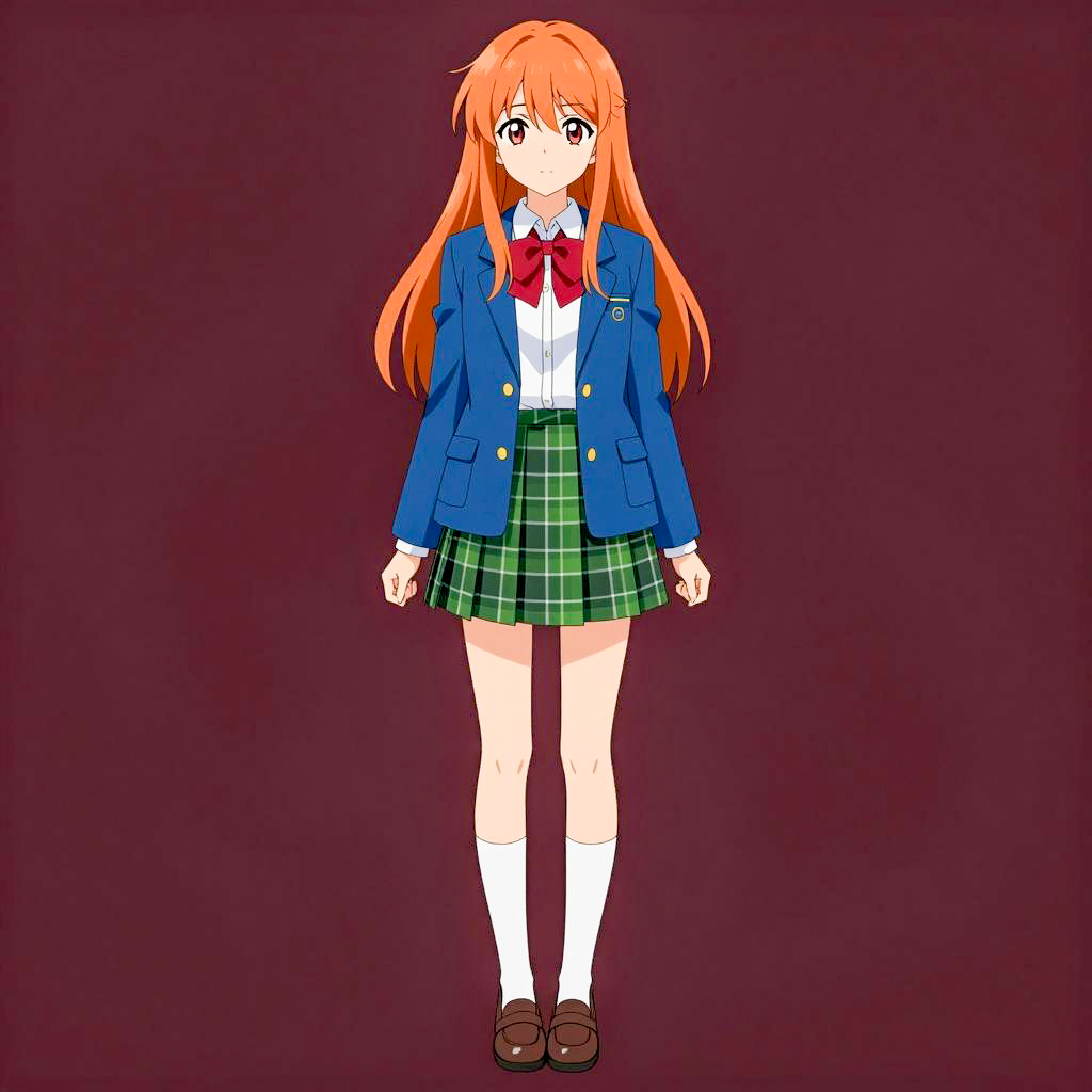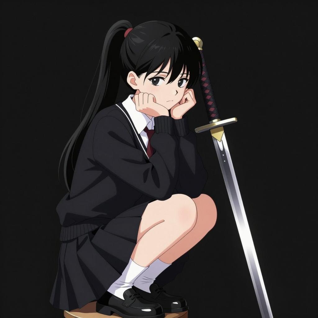 Japanese anime-style illustration of a young female student with long black hair sitting on a wooden desk in a classroom. She wears a dark blue school blazer with gold buttons, a white shirt with a blue bow tie, a gray cardigan, and a matching dark blue pleated skirt. The classroom setting includes empty wooden desks and green chalkboards in the background. The character looks calmly to the left with a neutral expression.