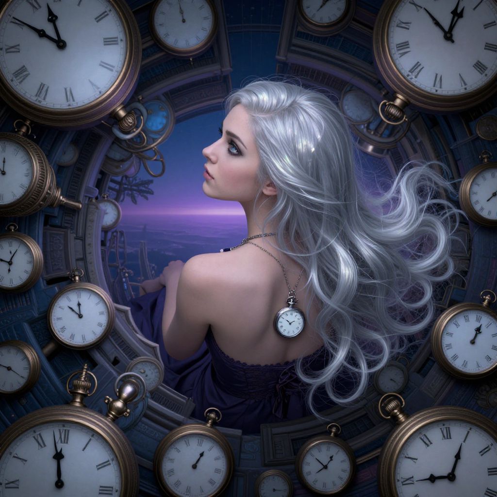 Digital artwork of a fair-skinned woman with long, wavy, silver hair gazing over her shoulder. She wears a black, strapless dress and a large, round pendant watch. Surrounding her are numerous gold clocks with white faces and black Roman numerals, creating a circular frame. The background features a twilight sky with shades of purple and blue, and a distant, indistinct landscape. The clocks' hands vary, some pointing to different times. The woman's expression is serene, and her hair has a shiny, almost metallic texture. The overall style is surreal and fantasy-like.