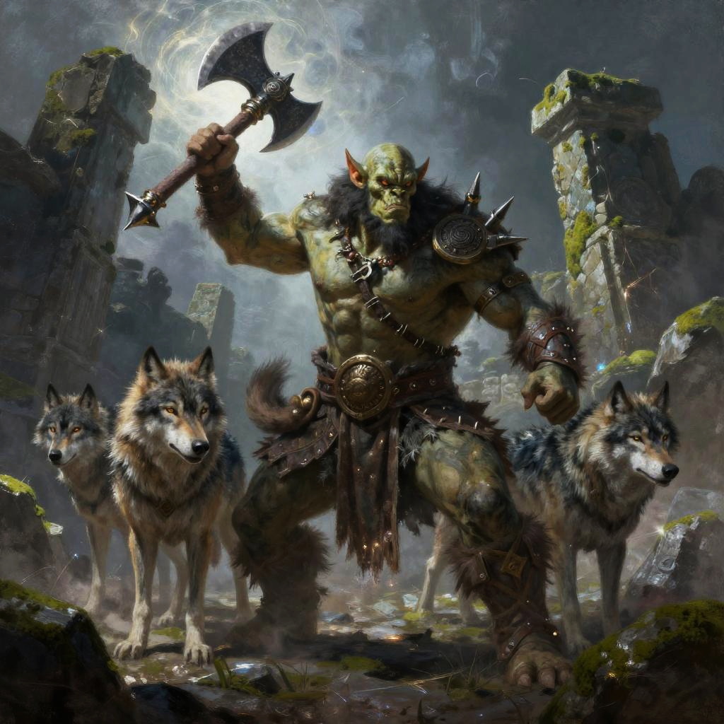 Malacath, the tribal orc god of strength and survival, depicted in a dynamic pose holding a spiked axe, with wild mountain wolves at his side, set against a backdrop of ancient stone ruins covered in moss, glowing faintly with mystical energy, in a dark fantasy painting style.