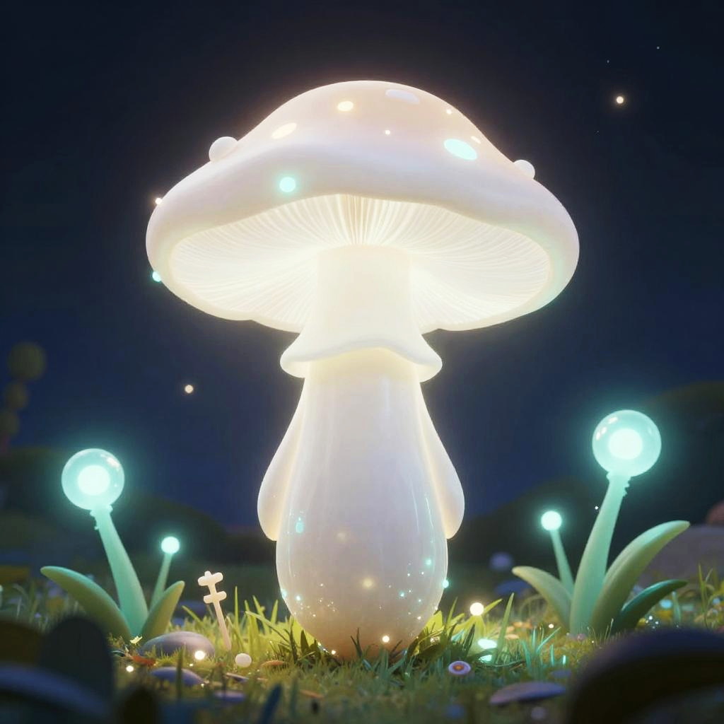 Fantasy character with a luminous white mushroom hat shaped like a wide fungus cap, ethereal glow, surrounded by bioluminescent plants, magical night scene