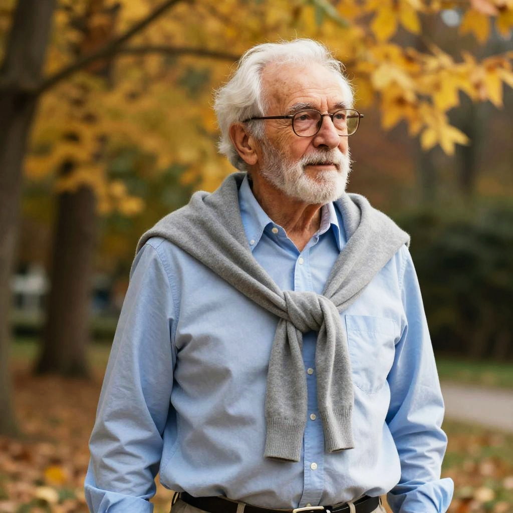 An elderly man with white hair and beard, wearing glasses and a light blue shirt with a gray sweater draped over his shoulders, standing outdoors in an autumn setting with blurred yellow foliage and greenery in the background, warm natural light casting soft shadows, candid and relaxed atmosphere