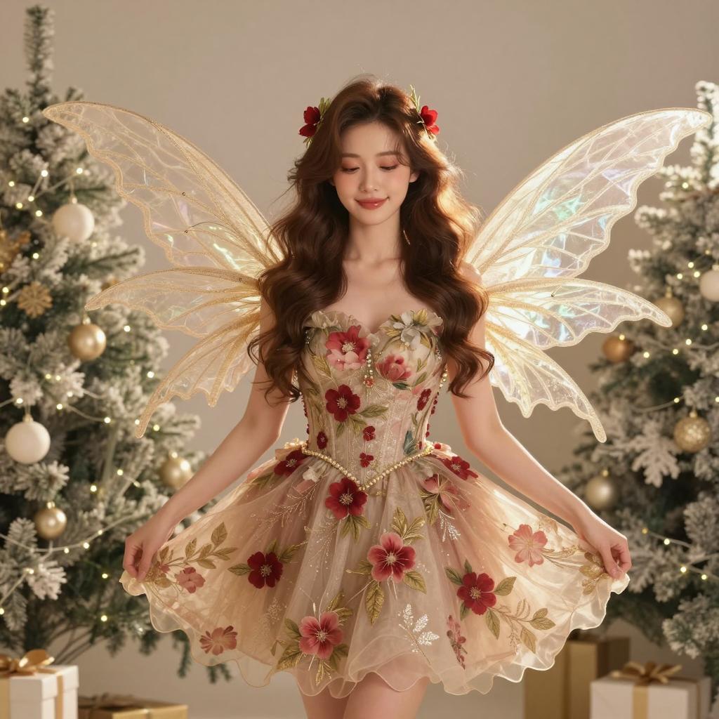 Christmas fairy dress, photograph of beautiful young woman, long wavy brown hair, wearing red and gold floral strapless dress, fairy wings, red floral headband, standing in front of Christmas tree with lights and ornaments, soft warm lighting, elegant, festive, Christmas theme, holding dress skirt slightly up, soft smile, realistic, detailed, high quality, holiday magic, fantasy-inspired, cozy background, Christmas decorations, fairytale-like atmosphere
