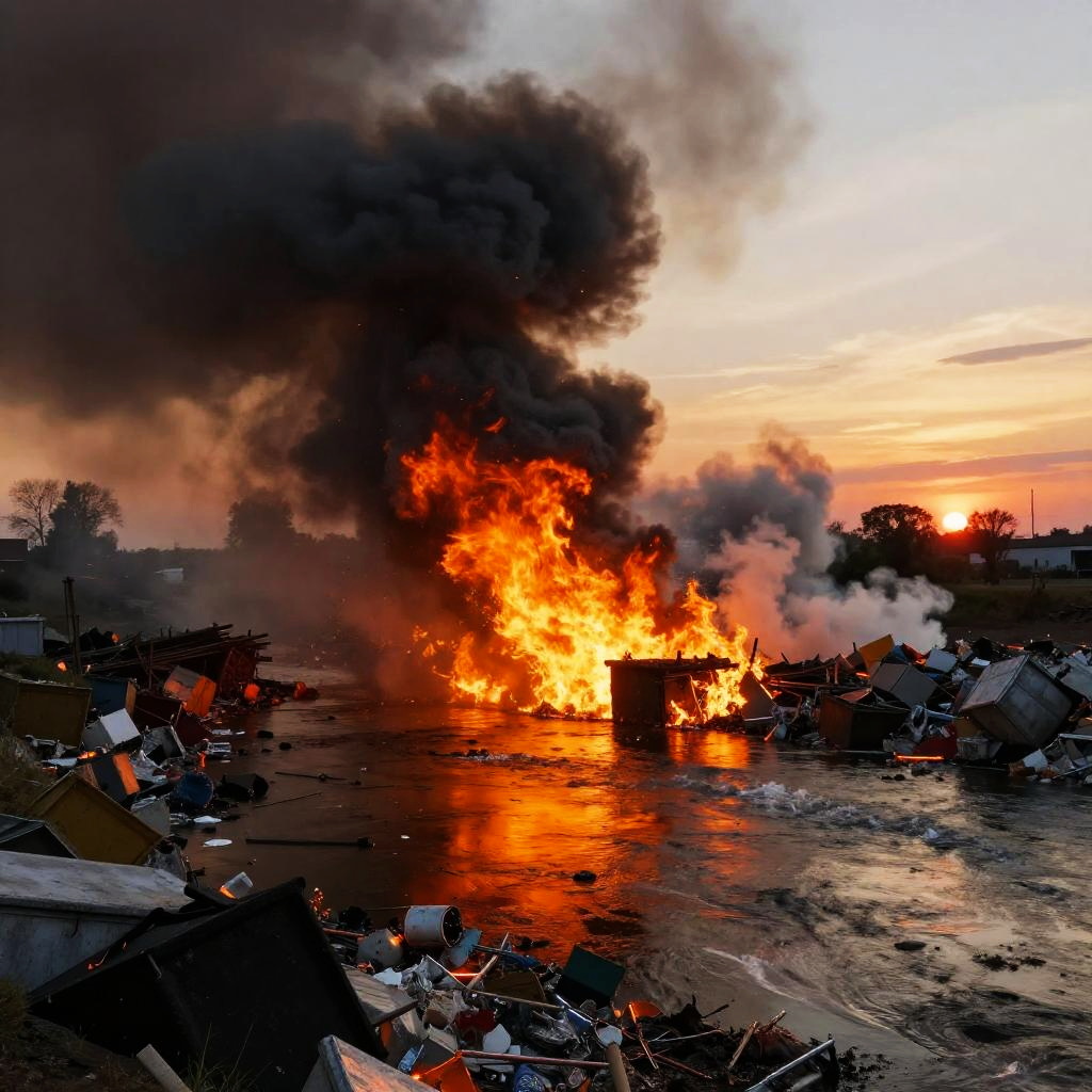 Dumpster fire river engulfed in blazing inferno, molten trash piles on both sides, heavy smoke cloud blending with sunset colors, gritty texture, hyper-detailed fantasy landscape