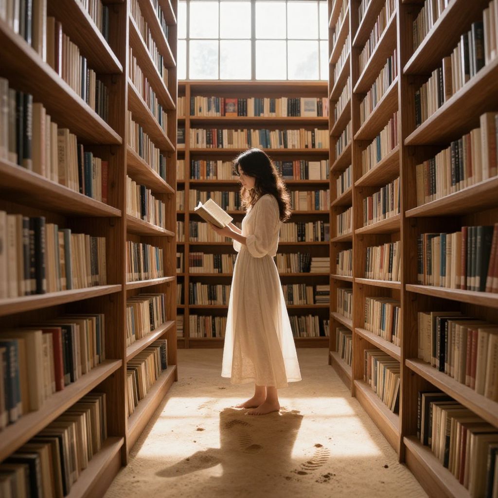 Photograph of a woman with long, dark hair standing in the center of a narrow library aisle with tall wooden bookshelves on both sides. She is wearing a white, long-sleeved, flowing dress and is barefoot. She is holding an open book, reading it, with sunlight streaming in from a large window at the top of the aisle, casting a warm glow. The bookshelves are filled with various books of different sizes and colors. The floor is wooden, and the overall scene has a serene, contemplative atmosphere.