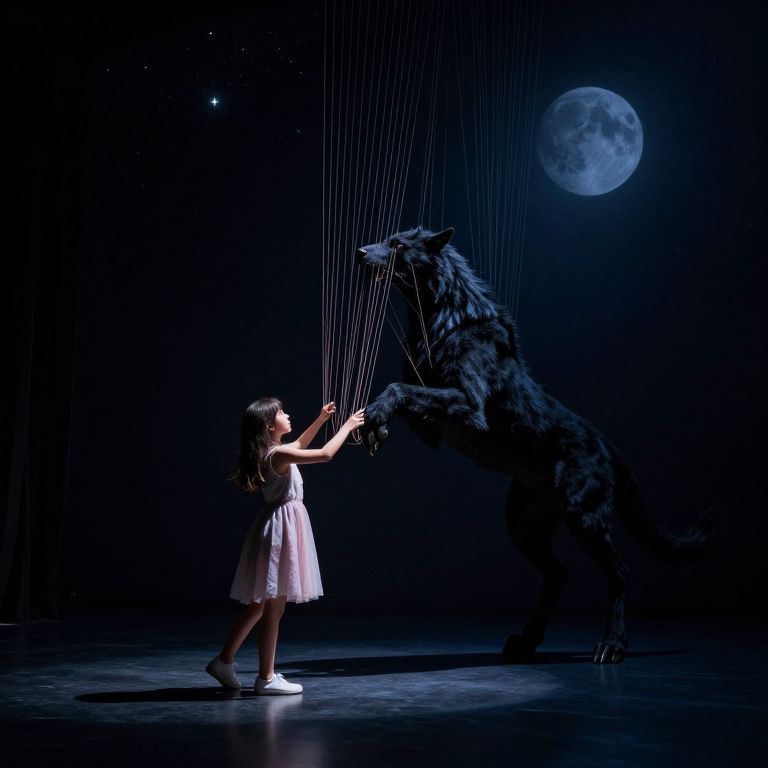 Photograph of a stage performance under a moonlit backdrop. A young girl with long brown hair, wearing a white sleeveless dress and white shoes, stands on the left, holding strings that control a large, dark, werewolf-like creature on the right. The werewolf is on its hind legs, reaching towards the girl. The stage is dimly lit with a spotlight on the girl, while the background features a large, bright full moon and a starry sky. The strings are taut, connecting the girl's hands to the werewolf's mouth. The mood is eerie and magical.