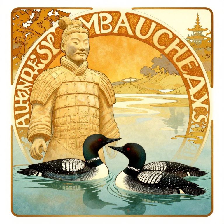 "Terracotta Warriors art nouveau style, alphonse mucha, illustration of a pair of loons swimming, near a shoreline, summer, sunny,"