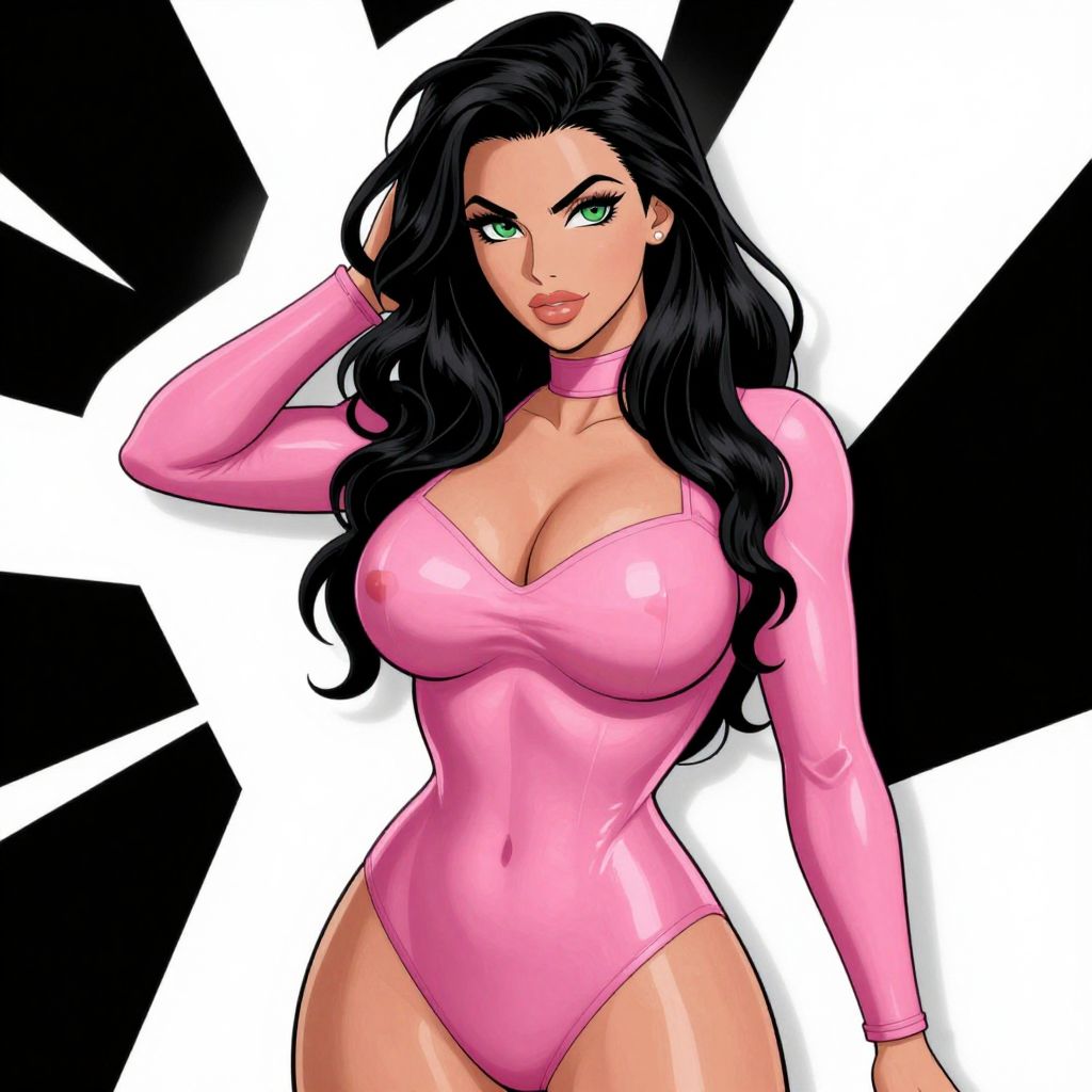 This is a digital illustration of a sexy, confident woman with long, wavy black hair and striking green eyes. She's wearing a tight, shiny pink bodysuit that accentuates her curvy physique and large breasts. Her right hand is raised, touching her hair, while her left arm rests by her side. She has a seductive look on her face. The background has bold black and white geometric shapes. The artwork has a vibrant, comic-style aesthetic.
