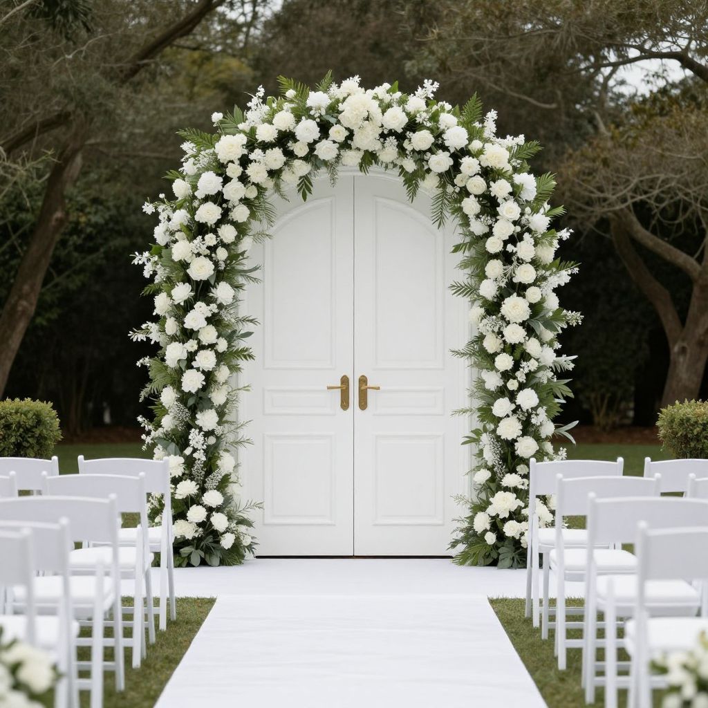 Elegant white double doors adorned with cascading floral arrangements frame a pristine outdoor wedding ceremony setup, featuring rows of white chairs flanking a central aisle pathway.