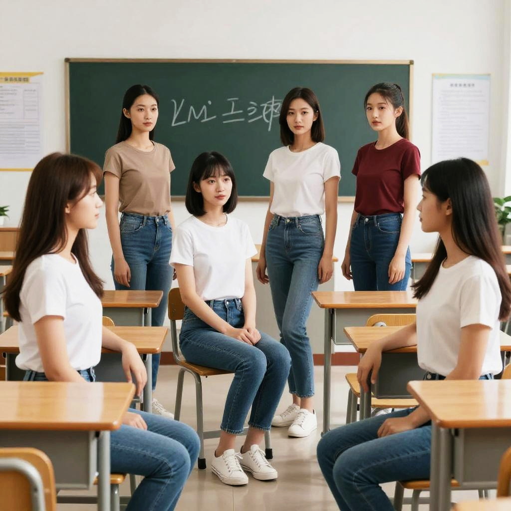 Multiple girls, denim, jeans, shirt, 6+girls, indoors, pants, chair, realistic, white shirt, sitting, classroom, brown hair, long hair, asian, short hair, black hair, multiple boys, breasts, desk, blue pants, red shirt, ponytail, standing, medium breasts