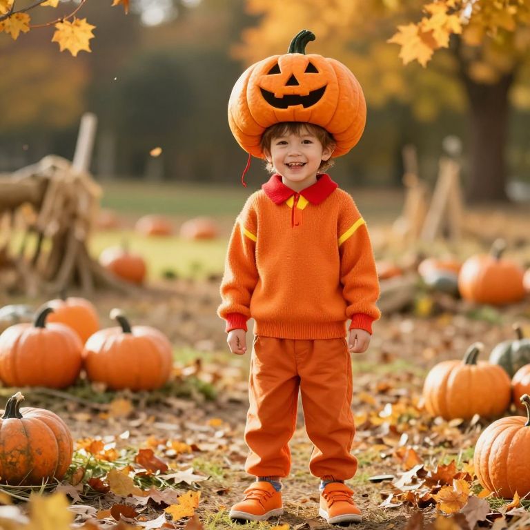 A cheerful young boy, around 8 years old, wearing a bright orange outfit with red and yellow accents, standing in a cozy autumn setting with falling leaves and a small pumpkin patch in the background. He is wearing an orange sweater, orange pants, and orange shoes, and has a large, smiling pumpkin hat on his head with a red string tied around it. The scene is sunny and warm, with soft golden hour lighting, giving it a festive and joyful atmosphere.