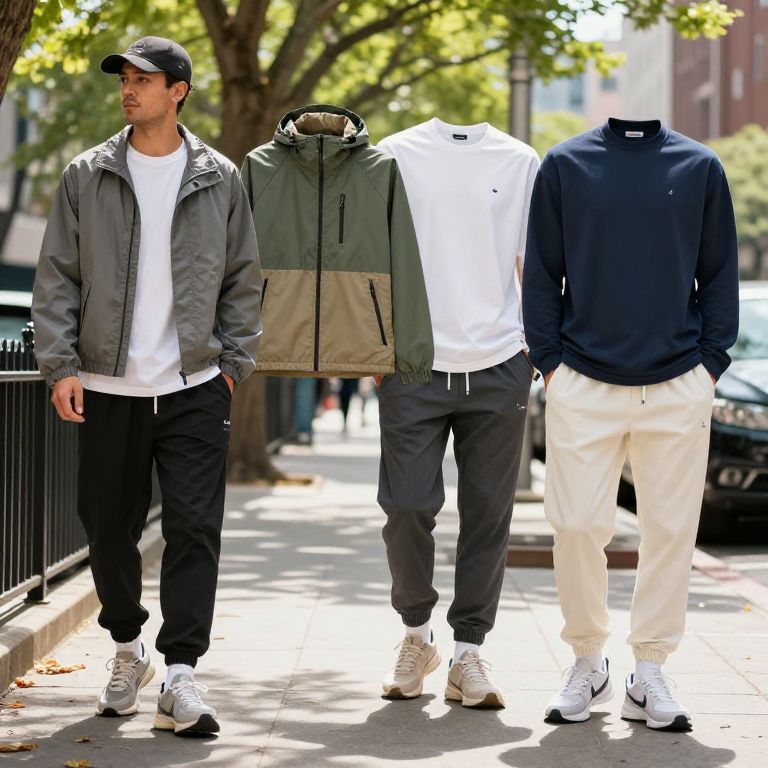 Streetwear for every season: A curated fashion lineup blending comfort and style—sun-protective jackets, layered windbreakers, long-sleeve tees, and spring-ready joggers—set in a vibrant city sidewalk with natural light filtering through trees.