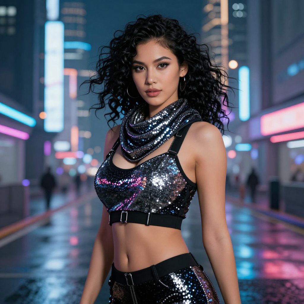 A tall, athletic woman with defined features, fair skin, and curly black hair wearing a sequined black and silver fashion scarf styled as part of a cyberpunk costume, standing in a futuristic cityscape at night with neon lights reflecting on wet pavement, the scarf fluttering slightly in the wind as she turns to face the camera.. The woman has big breasts and cute face