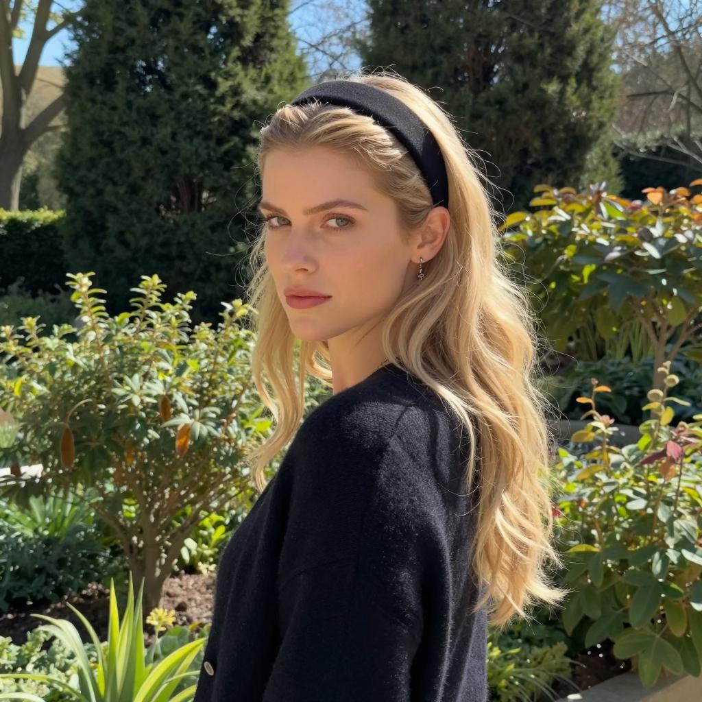 Blonde woman with wavy hair, wearing a black headband and dark cardigan, looks over her shoulder. Green garden with tall trees and bushes in the background. Bright sunlight. Upper body shot. She has a serious expression. Natural light.