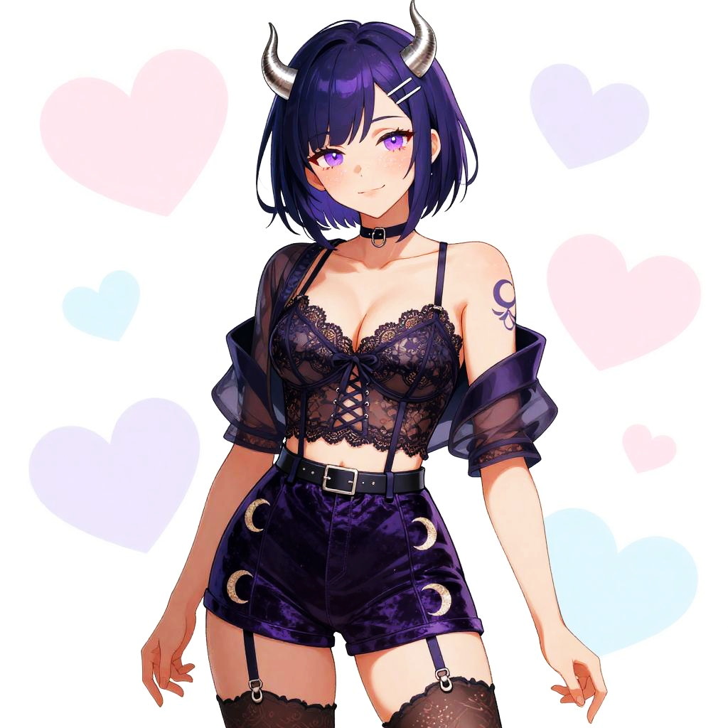 An anime style illustration of a mysterious young woman with a short indigo asymmetrical bob, silver hairpins, and a crescent moon clip, big breasts, wearing a lace-up corset top under a sheer bolero, high-waisted velvet shorts embroidered with moons, thigh-high patterned stockings with a garter belt, and delicate crescent moon tattoo trailing up her shoulder, small polished silver horns, and iridescent freckles across her cheeks. She has lavender eyes with a half-lidded smirk. The background is decorated with pastel hearts in shades of pink, lavender, and light blue. The artwork is colorful, vibrant, featuring soft shading and smooth line art, capturing a cute, friendly, and lively atmosphere.