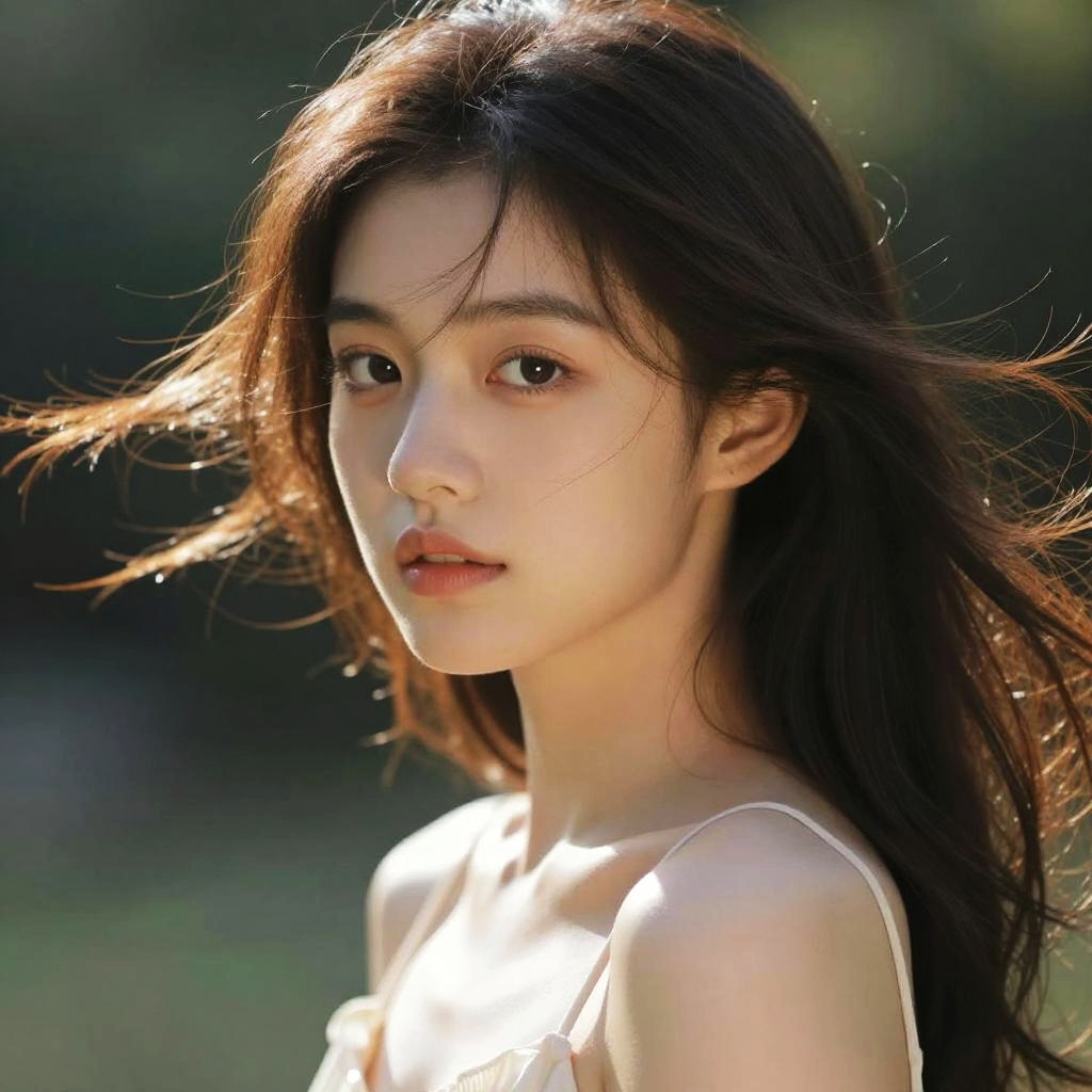Photograph of an East Asian woman with long, wavy, dark brown hair adorned with a white daisy flower on the right side. She has fair skin and delicate features, wearing a sleeveless, white, pleated dress that fits her slender frame. She stands outdoors in a blurred park setting with green trees and a grassy area in the background. The lighting is soft, highlighting her serene expression and the gentle texture of her dress. The overall composition is calm and natural, focusing on her gentle beauty and the simple elegance of her attire.