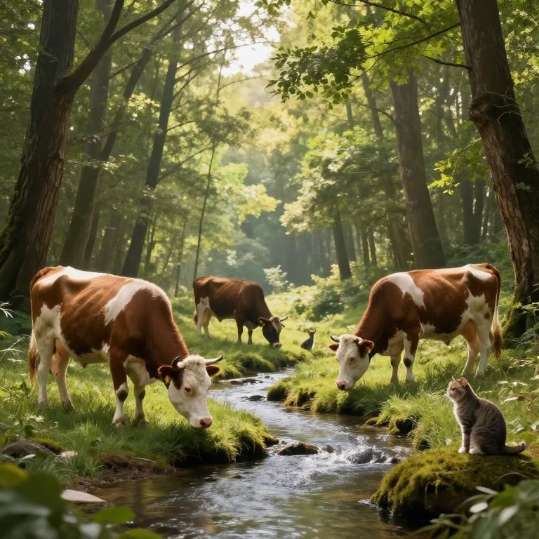 In a serene forest bathed in ethereal light, cows graze peacefully alongside a tranquil stream, while cats perch contemplatively, as if witnessing a hidden world where the laws of nature bend to embrace the impossible.