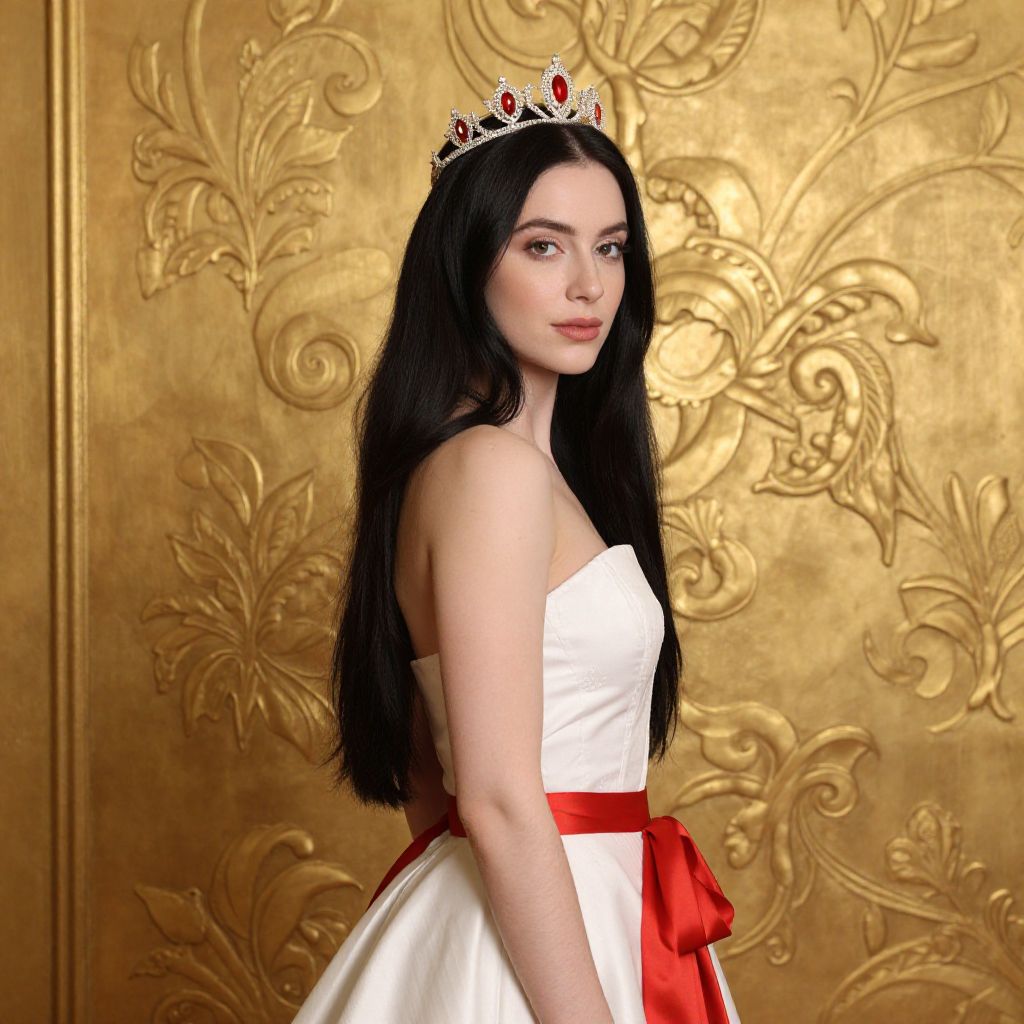 A woman with long black hair is wearing a white and red dress with a crown on her head. The woman is standing in front of a gold wall with a patterned design on it.