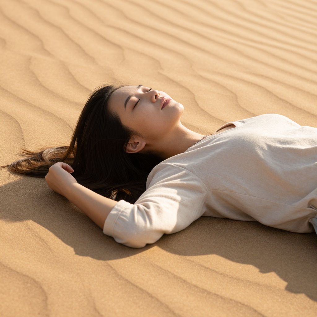 Bathed in the golden embrace of sunlight, a woman lies serenely upon the shifting sands, her closed eyes and gentle smile evoking a profound sense of freedom and timeless peace, as the whispers of the wind and the warmth of the earth cradle her in a moment of pure, unspoken contentment.