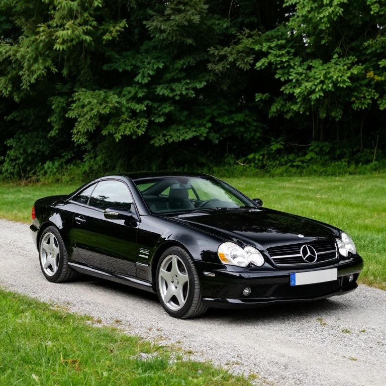 Parked gracefully on a gravel driveway, a sleek 2003 Mercedes-Benz SL55 AMG Black Series Conversion showcases its glossy black exterior, contrasting sharply against the vibrant green lawn and dense forest backdrop.