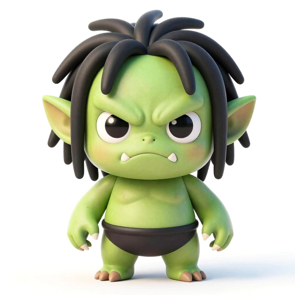 Chibi-style digital art of a green-skinned goblin with black dreadlocks, large eyes, frowning, small fangs, black loinc