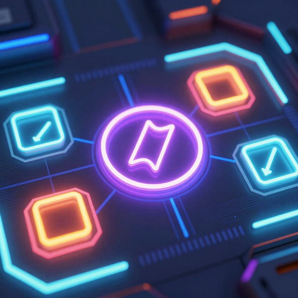 Progress symbols glowing with neon light on a futuristic digital interface, sleek modern design, vibrant colors, cyberpunk aesthetic, high detail, dynamic composition